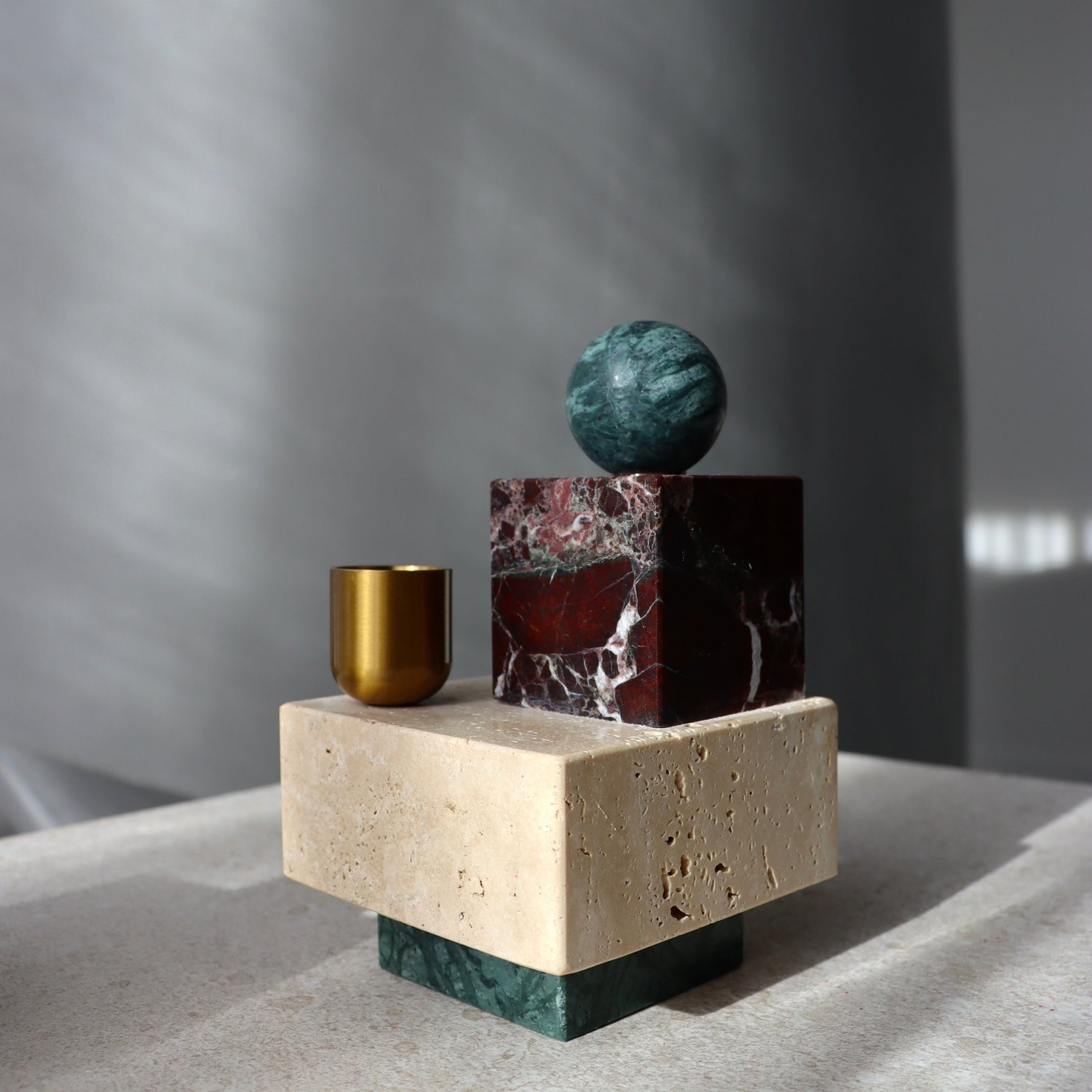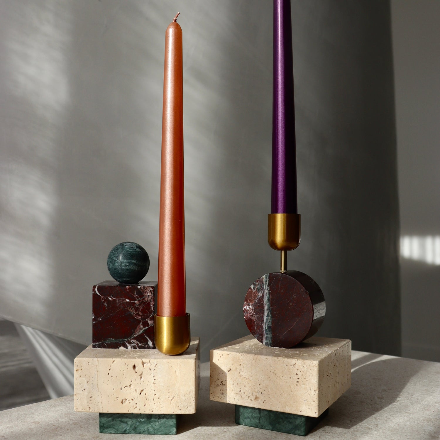 Lumina, a captivating candle holder that redefines elegance through its distinctive design and premium materials. Handcrafted from an exquisite trio of Travertine, Rosso Levanto, and India Verde marbles. The interplay of marble tones and the subtle sheen of the brass cup create a harmonious aesthetic that adapts seamlessly to your surroundings, making it a statement piece that effortlessly complements various decor styles.