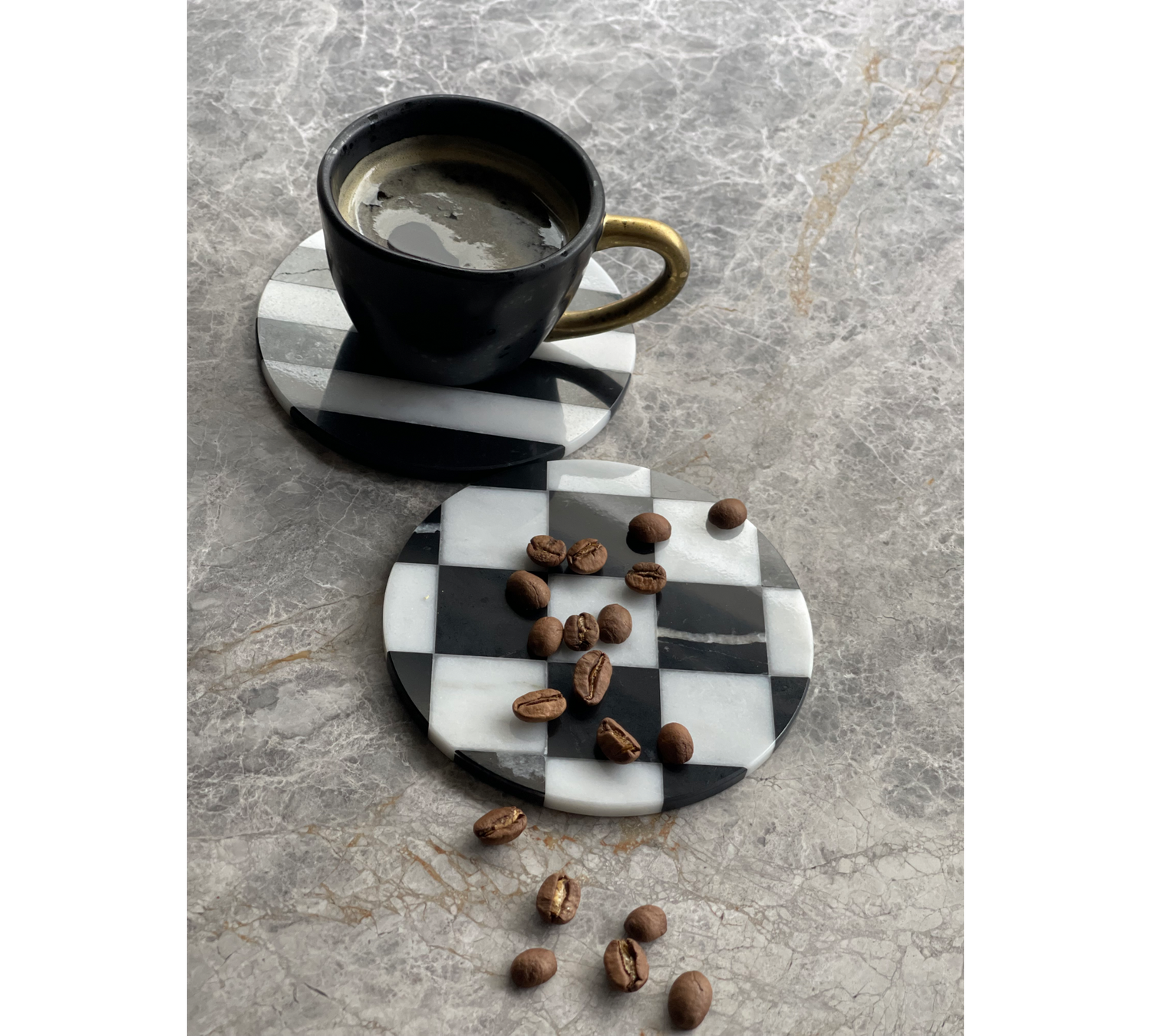 Silky Nero Marquina and Bianco Carrara marble are tied together to deliver a statement of style. Flawless finishing and polishing make these coasters the perfect accessory far beyond cocktail hour. Features a black powder-coated aluminum base. Comes in a set of 4.